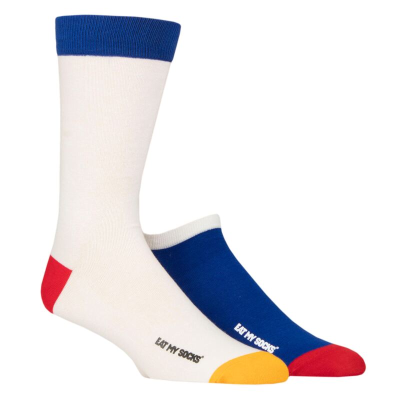 Watch your favourite egg lover crack up and see the funny, sunny side when you give them these EAT MY SOCKS Fried Egg Cotton Socks! The window box contains two pairs of unisex fit socks, bafflingly arranged and folded into the shape of a yummy fried egg — how do they do that?? Out of the box, the two pairs of socks — one pair crew length and one pair ankle high — are attractively designed in a Mondrian-style, in blocks of strong primary colours and white.